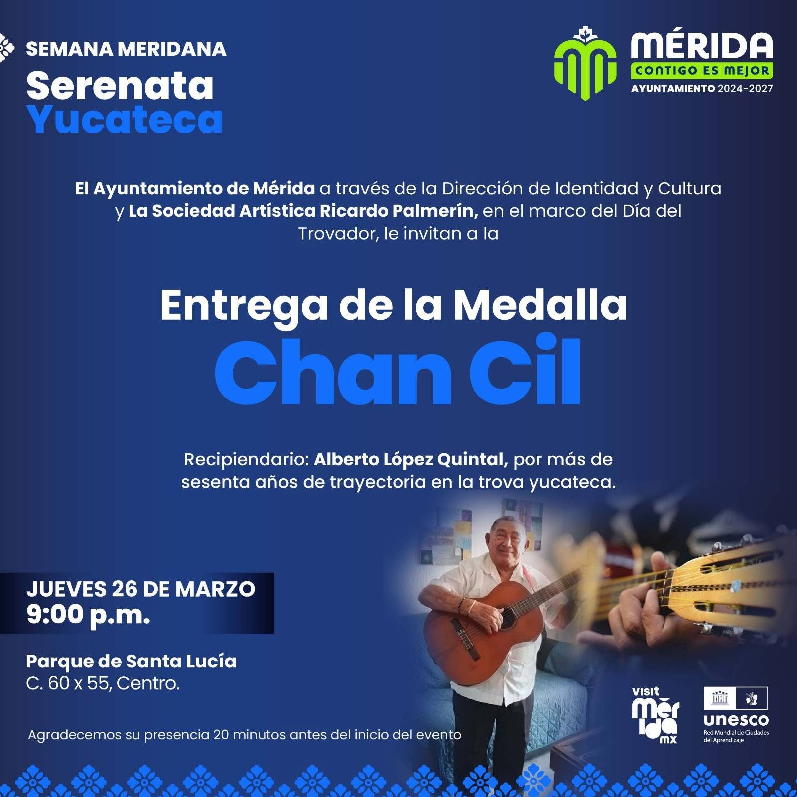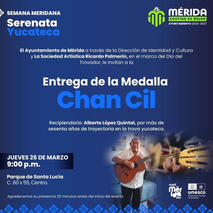 Por seis décadas caminando al lado de trova, el Ayuntamiento de Mérida entregará la Medalla “Chan Cil” al maestro Alberto López Quintal, el próximo jueves 26 de marzo en el marco de la tradicional “Serenata Yucateca”.